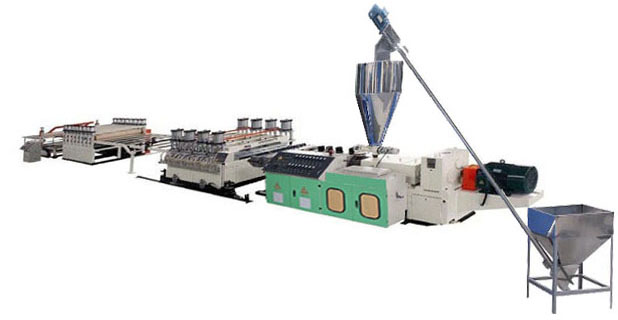 該生產(chǎn)線主要由混料機、上料機、雙螺桿擠出機、擠出板模具、水冷卻定型模具、定型平臺、八輥牽引機、機械手卸料架、落料架、破碎機、磨粉機組成。