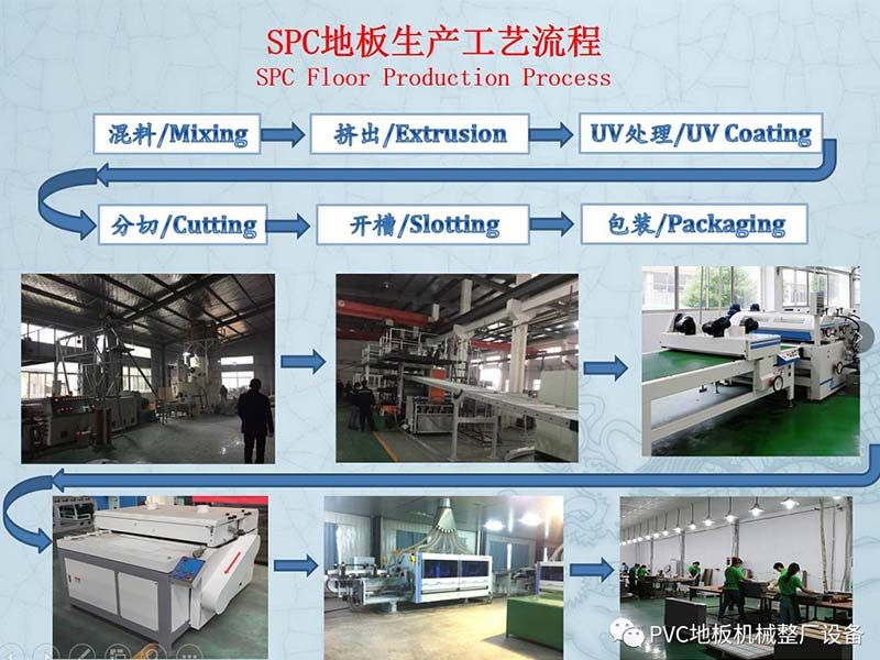 把混好原材料通過上料系統(tǒng)進入雙螺桿擠出機,進行加熱擠出在180度--195度→進入模頭來擠出成型,成型的基材經(jīng)過四輥壓延機,基材進行定厚→貼彩膜→貼耐磨層→冷卻→切割;