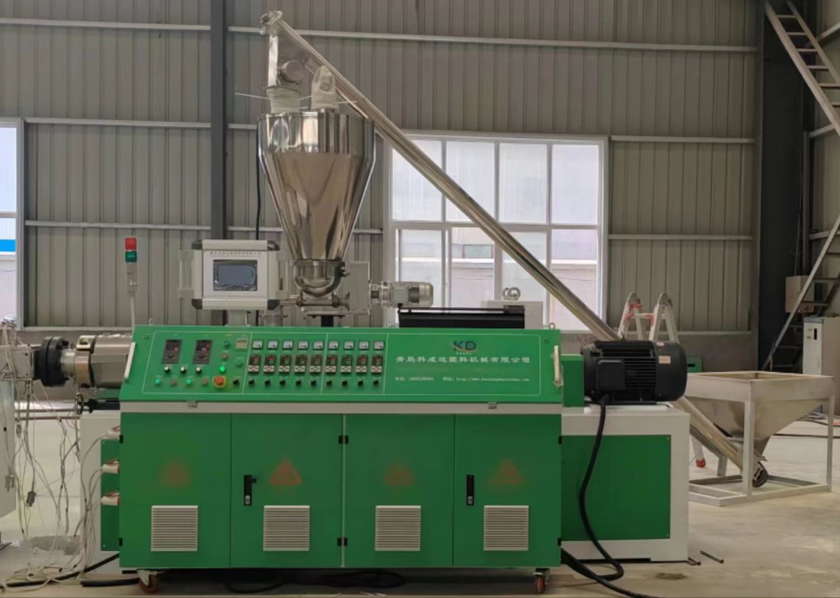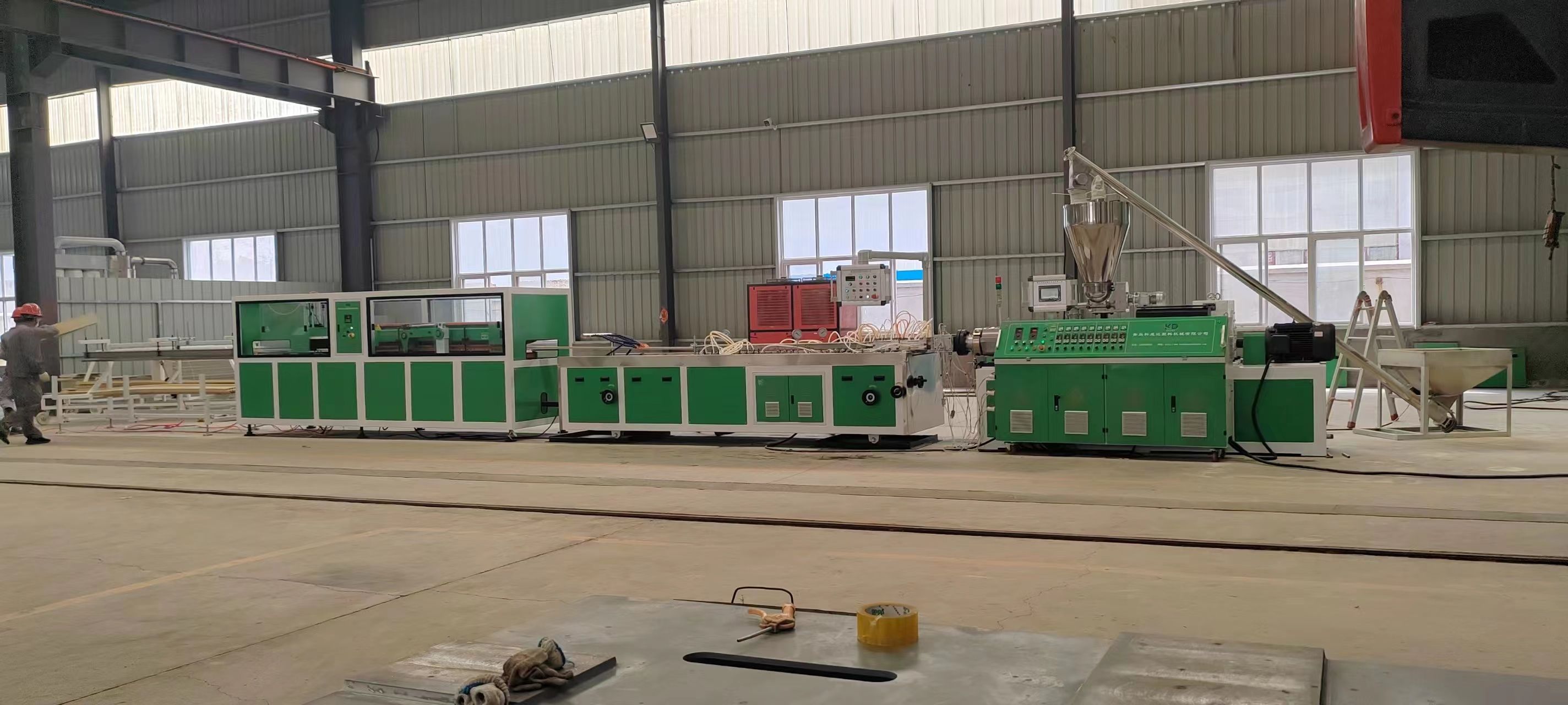 錐形雙螺桿擠出機(jī),模具,定型臺,牽引機(jī),切割機(jī),堆料架。配套輔機(jī):混料機(jī),覆膜機(jī)。