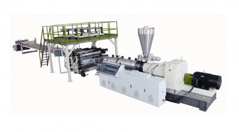 錐形雙螺桿擠出機(jī)--衣架式模具--四輥壓花裝置--四工位油溫機(jī)--冷卻裝置--縱向切邊裝置--四工位覆膜糾偏裝置--牽引機(jī)--切割機(jī)和卸料架組成。